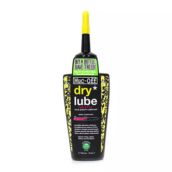 Le lubrifiant Muc-Off Dry est une huile de lubrification à sec qui crée un film de longue durée qui améliore le fonctionnement, protège et réduit le frottement de la transmission de la chaîne.