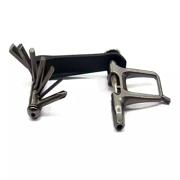 – Outils en aluminium découpés, levier démonte les pneus, tournevis étoile , T20, T25, clé à rayons 14g, clés Allen 2-6, 8