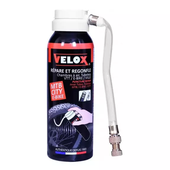 Le spray anti-crevaison Velox 75 ml a un connecteur flexible et un bouton de contrôle de flux et de réglage de pression.